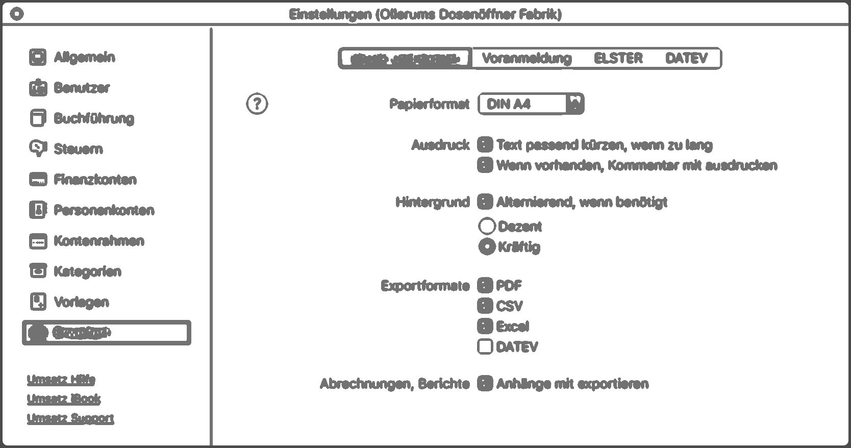 Ja, Umsatz kann auf Wunsch auch DATEV Dateien exportieren; allerdings ist diese Option bewusst nicht als Standard voreingestellt, da DATEV zwingend eine Doppelte Buchhaltung, Abschreibungs- und Steuerkonten, Buchungsschlüssel und noch so einiges mehr (wie eine richtige Kontenlänge) voraussetzt. Dass dabei eine Menge schief gehen kann, erklärt sich fast von selber - darum gibt es nur zu DATEV auch einen eigenen, längeren Artikel: Die Sache mit DATEV - XML